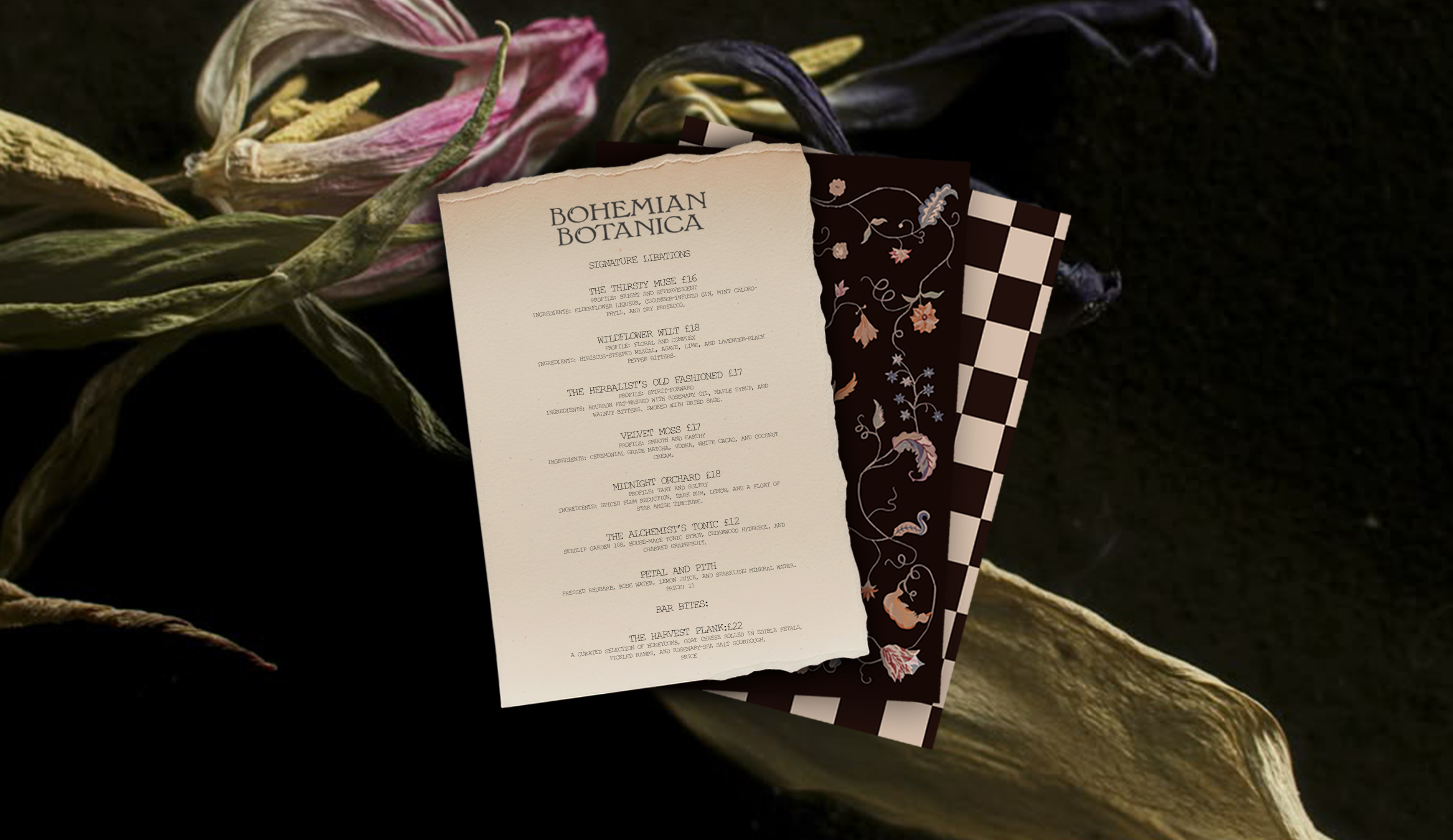 Bohemian Botanica is a comprehensive visual identity project that explores the intersection of traditional apothecary aesthetics and modern botanical mixology. The brand is built on a "Wild Apothecary" concept, utilizing a moody color palette of deep crimson, earthy stone, and lush greens to create a grounded yet elevated atmosphere.